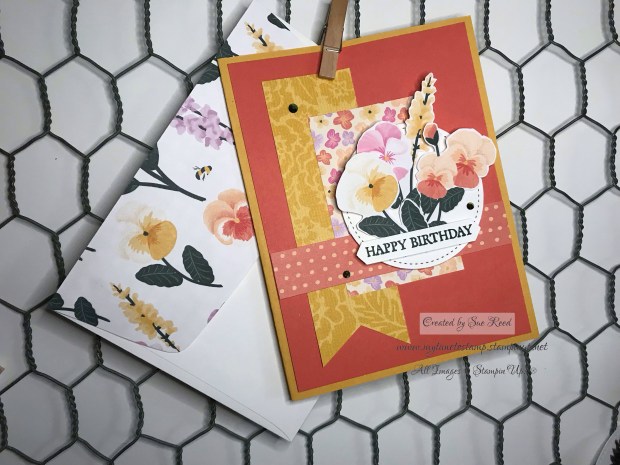 Here’s a fun layout for a birthday card. Use a 4 1/4” x 11” piece of card stock, scored at 5 1/2”, folded to make the card base. Add a layer of 4” x 5 1/4” card stock. Add the following DSP: 1 1/2” x 5”, flagged on one end; 2” x 3”; 3/4” x 4”; add a label. The flowers are “fussy cut” from Stampin Up!’s Pansy Petals DSP. Here is the link to my online store: https://mytimetostamp.stampinup.net